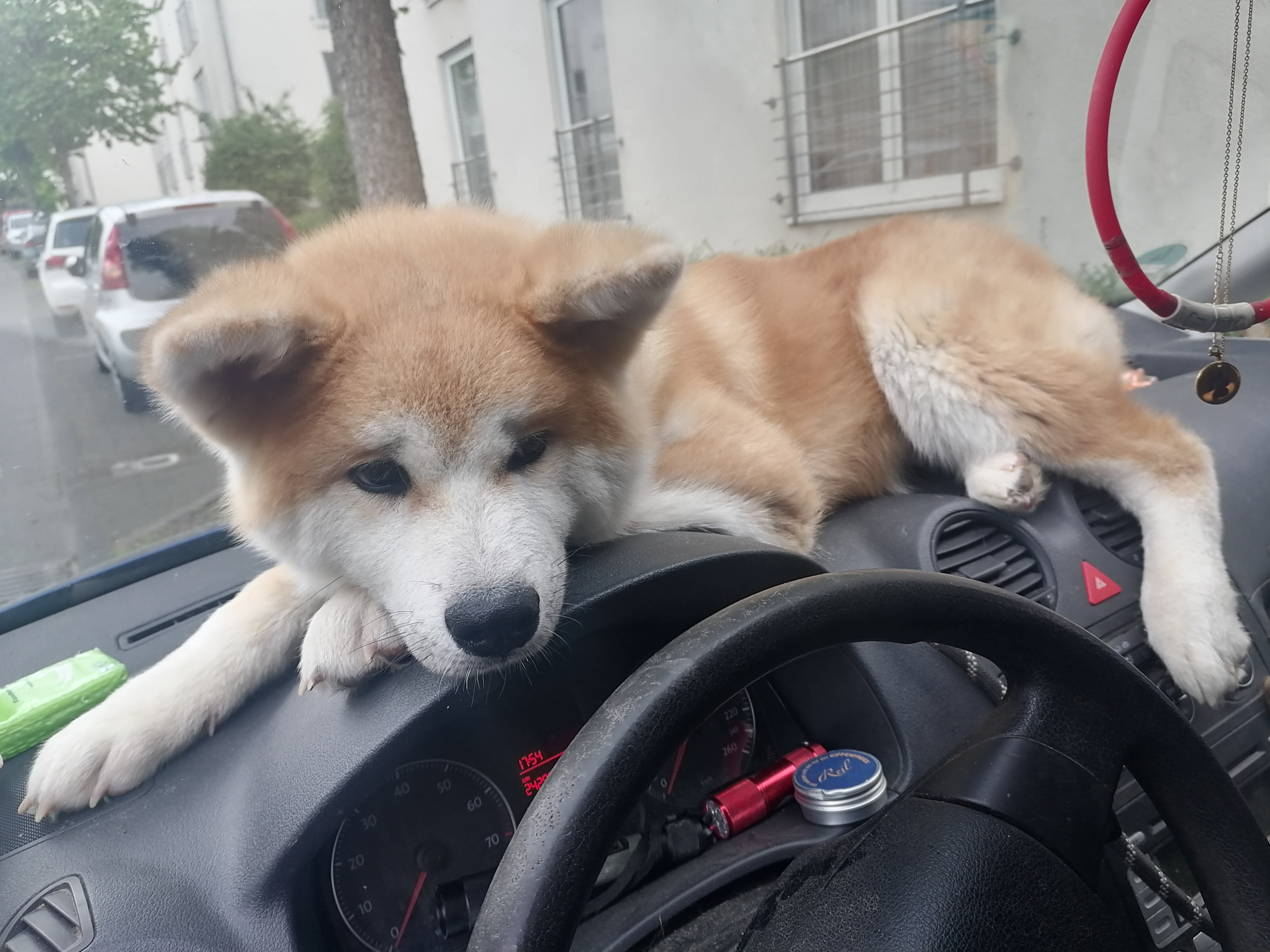 Frisch von der Züchterin, lege ich mich als Welpe einfach mal auf das Armaturenbrett.