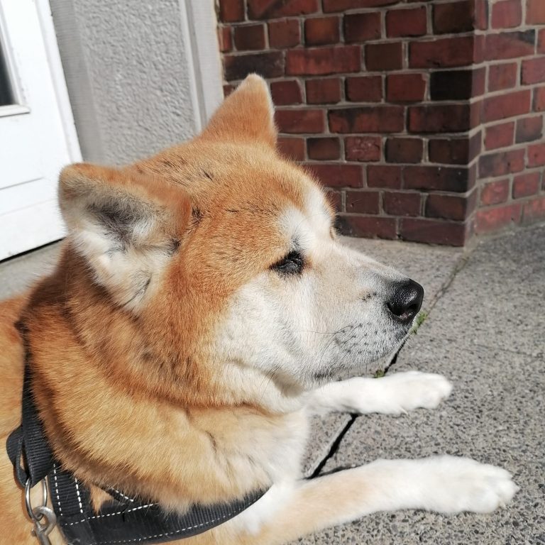 Ca. 3 Jahre später fragte mich ein Schützenbruder: „Sag mal, Du hattest doch früher mal einen Hund, willste nicht wieder einen?“ Ich fragte warum und er erzählte mir, dass er in einer Tierschutzgruppe sei, die gequälte und misshandelte Hunde befreie und sie hätten da gerade einen Hund, den diese Gruppe nicht loswürde… „zeig mal nen Foto! Um Gottes Willen, ein Akita!“ Ich hatte von dieser schwierigen und eigensinnigen Rasse schon gehört und das kam so gar nicht für mich infrage. 3 Nächte habe ich von ihm geträumt, dann sind wir nach Berlin gefahren, um ihn abzuholen. Ich habe ihn „Dikka“ genannt. Dikka war völlig traumatisiert und fast blind, da er seine ersten 3 Lebensjahre im nassen, dunklen Keller gehalten wurde, Weil seine Vorbesitzer mit ihm nicht klargekommen sind. Es sind ja immer die Hunde schuld, niemals der Mensch! Dikka hatte vor ALLEM Angst, zuckte bei jeder schnellen Bewegung der Hände und Füße zurück, weil er Schläge und Tritte erwartete.